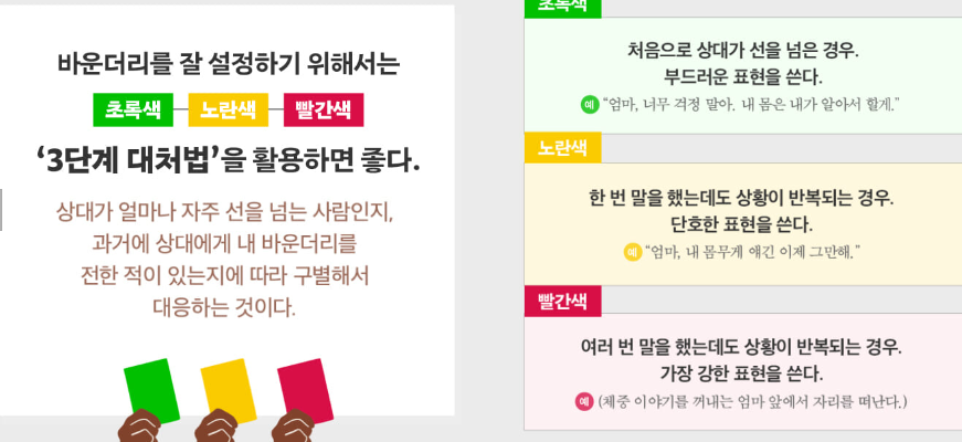 - 규칙 정의: 상대방이 당신에게 ‘요구해서는 안 되는 것’ 또는 ‘당신이 반드시 지켜야 하는 것’을 명확히 정의하세요. (예: “밤 10시 이후에는 업무 관련 연락을 받지 않는다”, “내가 원치 않는 주제에 대해 조언을 강요하지 말아달라”).